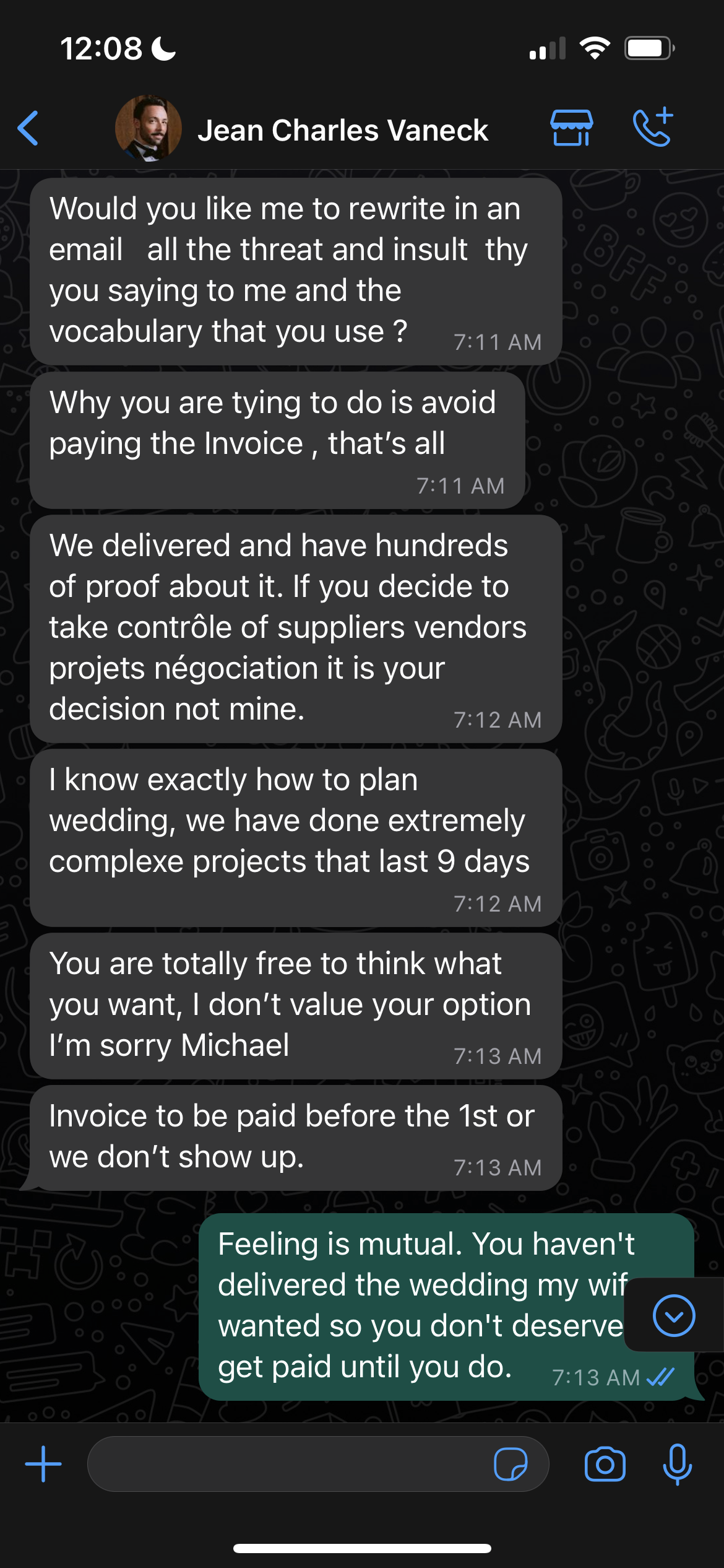 I want to share this communication because it's important to understand how the wedding industry works. Like many other freelance jobs, you pay a deposit, which we did. There were three installments, 9000€, 9000€, and the final payment was to be 8000€. We paid the first two amounts, but after all the issues I had with Jean Charles I did not feel comfortable wiring him the last transfer.